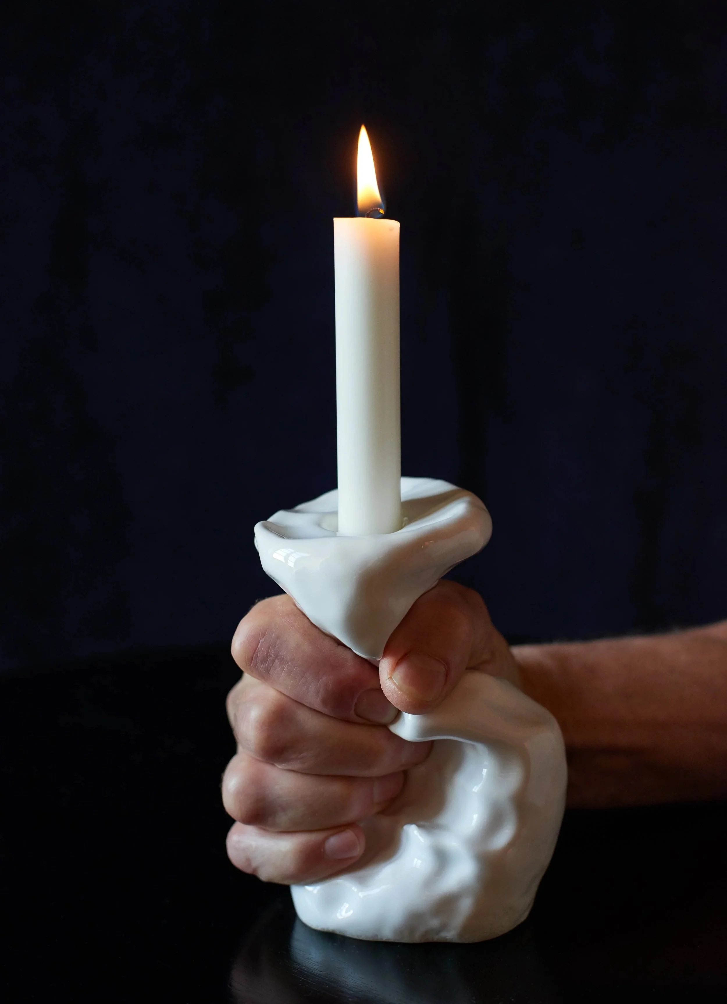 Der in Zürich und Frankreich arbeitende Maler und Zeichner Lukas Hofkunst, der sich überdies mit monumentalen Stahlskulpturen einen Namen gemacht hat, schuf exklusiv für Artiana eine Terre-cuite-Edition von 100 Unikaten in Form eines Kerzenleuchter-Paares. Die Leuchter sind buchstäblich handmade, das heisst, sie wurden noch in weichem Zustand je von seiner Linken wie von seiner Rechten fest umschlossen, bevor sie in den Brennofen gelangten: Die Hand ballt sich zur Faust und wird zur Signatur. Die so entstandenen Hofkunst-«Fäustlinge» – ganz in Weiss, «Grandseigneur» genannt – ergänzen sich ideal in ihrer praktischen wie dekorativen Funktion.